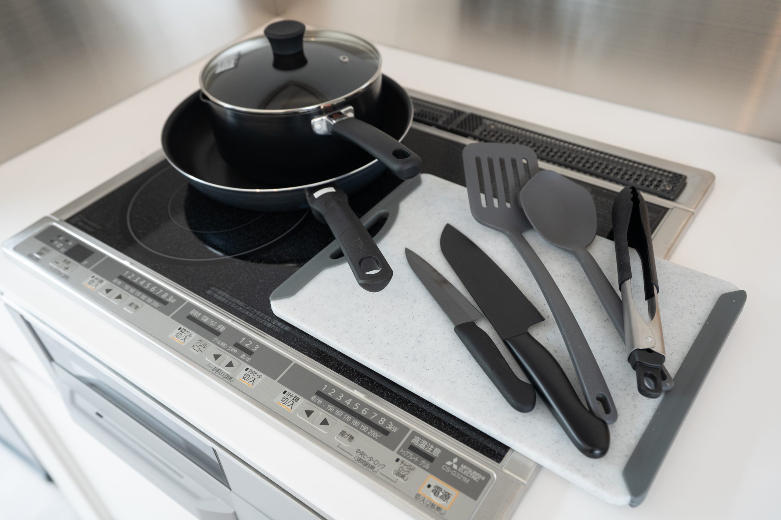 お料理用のキッチンツール、簡単な調味料(塩/胡椒/砂糖/油など)をご用意しています。