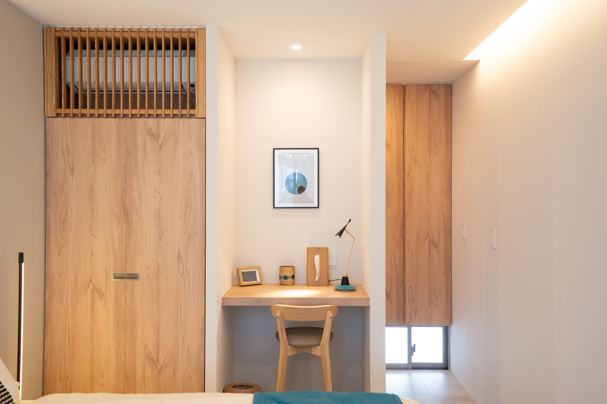 片方の寝室には備え付けの机があり、Wi-Fi環境を提供しています。